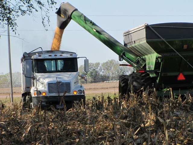 The shelled corn is collected in the top of the combine. When it gets full, the machine alerts Brad so the tractor and wagon can come along side while the corn is "elevated" into the wagon - all on the "fly."I have nothing but respect for young farmers these days and I want to thank Brad for taking this old grandma along on a great ride.